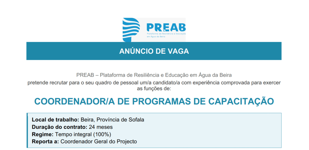 Submissão: administracao@preab.org.mz com o assunto: “Candidatura – Coordenador/a de